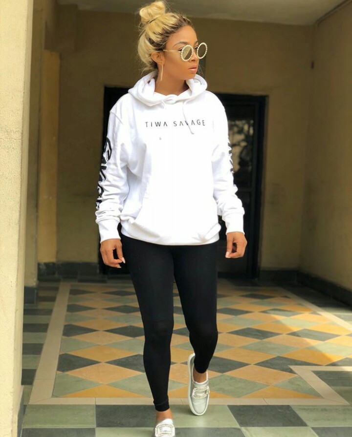 Nigerian radio personality and television host, Toke Makinwa shared this photo of herself rocking Tiwa savage's sweatshirt